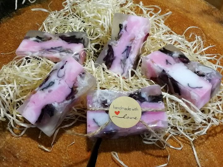 mýdlová hmota s bambuckým máslem, mýdlová hmota s aloe vera, sušená růže , esenciální růžový olej, barvivo mica, vitamín E